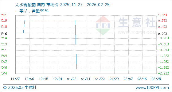 2月25日,生意社无水硫酸钠基准价为506.00元/吨,与本月初持平。