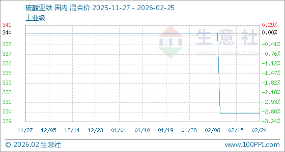 2月25日,生意社硫酸亚铁基准价为330.00元/吨,与本月初(340.00元/吨)相比,下降了2.94%。