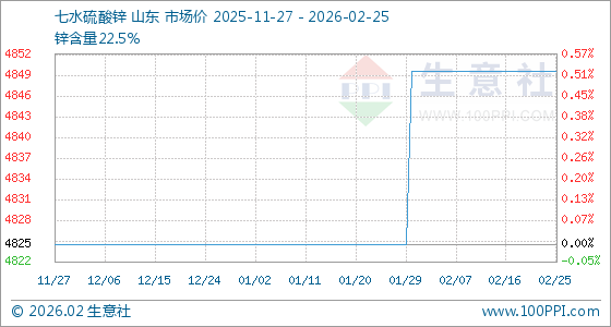 2月25日,生意社七水硫酸锌基准价为4850.00元/吨,与本月初持平。
