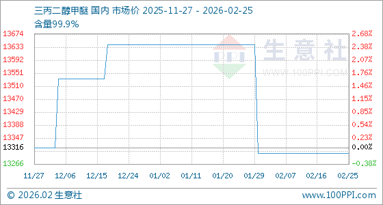 2月25日,生意社三丙二醇甲醚基准价为13300.00元/吨,与本月初持平。