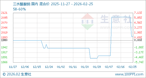 2月25日,生意社三水醋酸钠基准价为1900.00元/吨,与本月初持平。