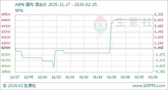 2月25日,生意社AIBN基准价为45000.00元/吨,与本月初持平。