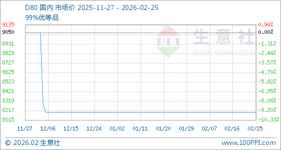 2月25日,生意社D80基准价为8200.00元/吨,与本月初持平。
