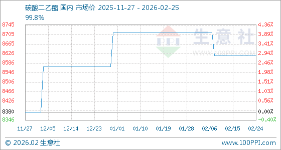 2月25日,生意社碳酸二乙酯基准价为8616.67元/吨,与本月初(8712.50元/吨)相比,下降了1.1%。