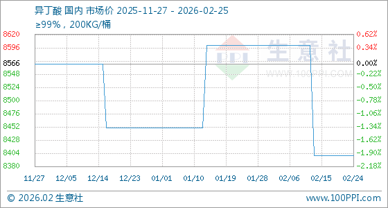 2月25日,生意社异丁酸基准价为8400.00元/吨,与本月初(8600.00元/吨)相比,下降了2.33%。