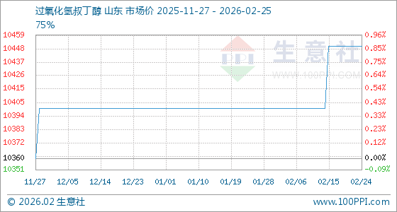2月25日,生意社过氧化氢叔丁醇基准价为10450.00元/吨,与本月初(10400.00元/吨)相比,上涨了0.48%。