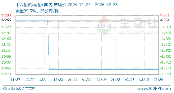 2月25日,生意社十六酸(棕榈酸)基准价为13000.00元/吨,与本月初持平。
