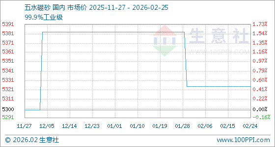 2月25日,生意社五水硼砂基准价为5325.00元/吨,与本月初持平。