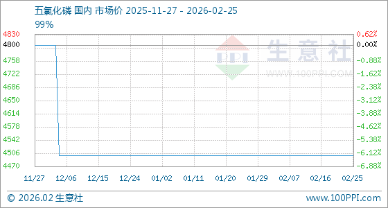 2月25日,生意社五氯化磷基准价为4500.00元/吨,与本月初持平。
