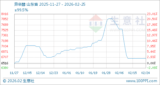 2月25日,生意社异辛醇基准价为6666.67元/吨,与本月初(7880.00元/吨)相比,下降了15.4%。
