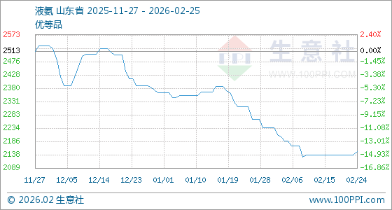 2月25日,生意社液氨基准价为2150.00元/吨,与本月初(2236.67元/吨)相比,下降了3.87%。