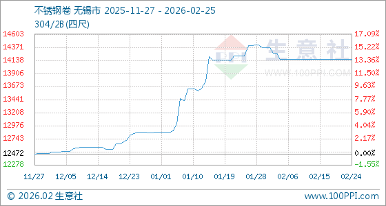 2月25日,生意社不锈钢卷基准价为14162.50元/吨,与本月初(14360.00元/吨)相比,下降了1.38%。