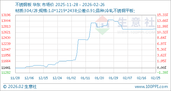 2月26日,生意社不锈钢板基准价为12733.33元/吨,与本月初(12991.67元/吨)相比,下降了1.99%。