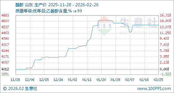 2月26日,生意社醋酐基准价为4565.00元/吨,与本月初(4590.00元/吨)相比,下降了0.54%。