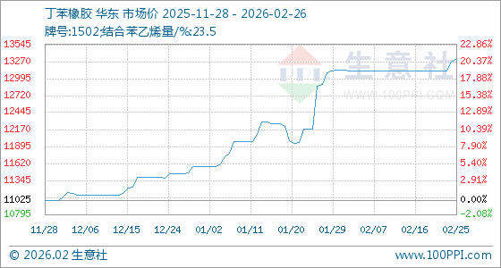 2月26日,生意社丁苯橡胶基准价为13316.67元/吨,与本月初(13133.33元/吨)相比,上涨了1.40%。