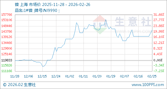 2月26日,生意社镍基准价为145233.33元/吨,与本月初(146016.67元/吨)相比,下降了0.54%。