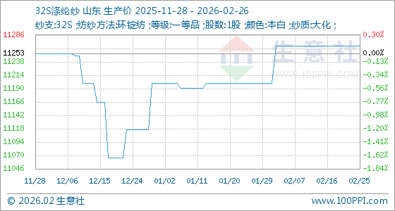 2月26日,生意社32S涤纶纱基准价为11266.67元/吨,与本月初(11200.00元/吨)相比,上涨了0.60%。