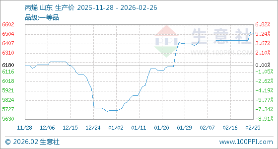 2月26日,生意社丙烯基准价为6514.33元/吨,与本月初(6404.33元/吨)相比,上涨了1.72%。