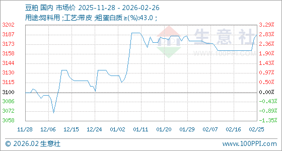 2月26日,生意社豆粕基准价为3188.00元/吨,与本月初(3178.00元/吨)相比,上涨了0.31%。
