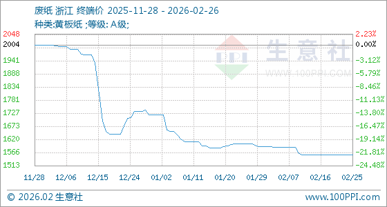 2月26日,生意社废纸基准价为1558.00元/吨,与本月初(1592.00元/吨)相比,下降了2.14%。