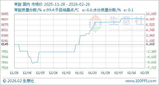 2月26日,生意社苯胺基准价为8845.00元/吨,与本月初(8745.00元/吨)相比,上涨了1.14%。