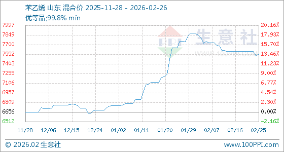 2月26日,生意社苯乙烯基准价为7550.00元/吨,与本月初(7874.00元/吨)相比,下降了4.11%。