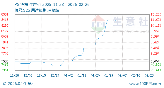 2月26日,生意社PS基准价为8400.00元/吨,与本月初(8433.33元/吨)相比,下降了0.4%。