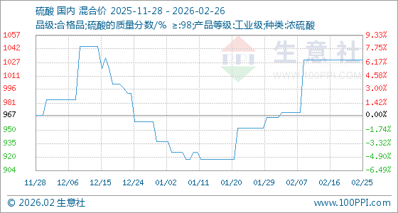 2月26日,生意社硫酸基准价为1030.00元/吨,与本月初(965.00元/吨)相比,上涨了6.74%。