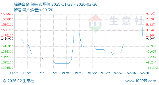 2月26日,生意社镝铁合金基准价为1575000.00元/吨,与本月初(1385000.00元/吨)相比,上涨了13.72%。