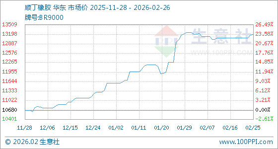2月26日,生意社顺丁橡胶基准价为13190.00元/吨,与本月初(13250.00元/吨)相比,下降了0.45%。