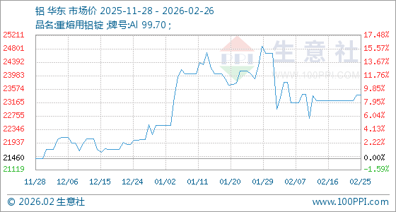 2月26日,生意社铝基准价为23396.67元/吨,与本月初(24666.67元/吨)相比,下降了5.15%。