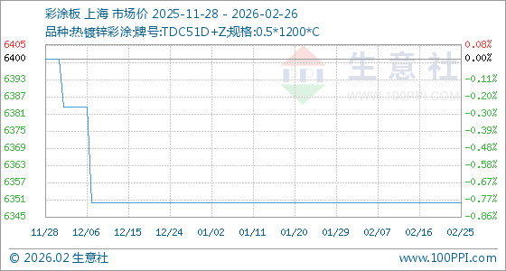 2月26日,生意社彩涂板基准价为6350.00元/吨,与本月初持平。