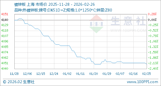 2月26日,生意社镀锌板基准价为4050.00元/吨,与本月初(4055.00元/吨)相比,下降了0.12%。