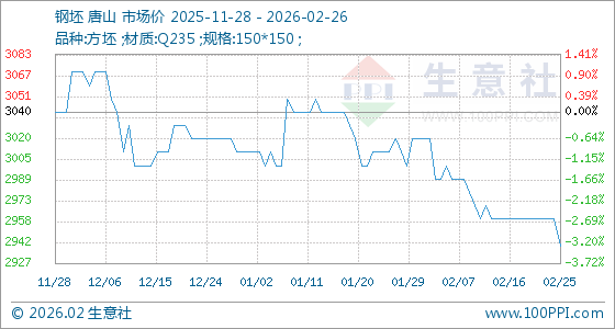2月26日,生意社钢坯基准价为2940.00元/吨,与本月初(3020.00元/吨)相比,下降了2.65%。