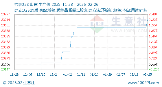 2月26日,生意社棉纱32S基准价为23725.00元/吨,与本月初(23625.00元/吨)相比,上涨了0.42%。