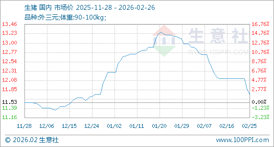 2月26日,生意社生猪基准价为11.72元/公斤,与本月初(12.98元/公斤)相比,下降了9.71%。