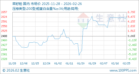 2月26日,生意社菜籽粕基准价为2630.00元/吨,与本月初(2600.00元/吨)相比,上涨了1.15%。
