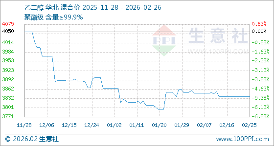 2月26日,生意社乙二醇基准价为3838.33元/吨,与本月初(3850.00元/吨)相比,下降了0.3%。