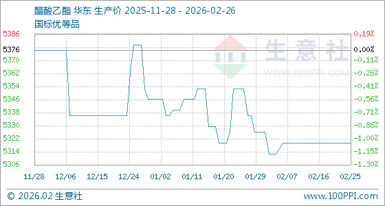 2月26日,生意社醋酸乙酯基准价为5320.00元/吨,与本月初(5326.67元/吨)相比,下降了0.13%。