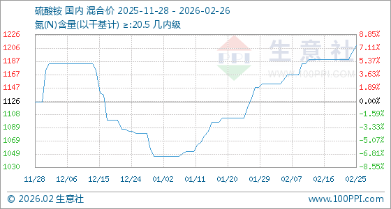 2月26日,生意社硫酸铵基准价为1210.00元/吨,与本月初(1153.33元/吨)相比,上涨了4.91%。