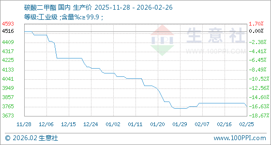 2月26日,生意社碳酸二甲酯基准价为3766.67元/吨,与本月初(3750.00元/吨)相比,上涨了0.44%。