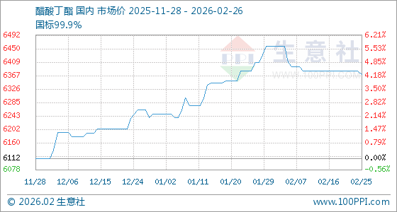 2月26日,生意社醋酸丁酯基准价为6370.00元/吨,与本月初(6457.50元/吨)相比,下降了1.36%。