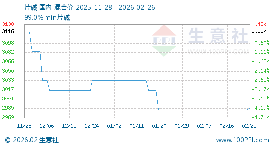 2月26日,生意社片碱基准价为2986.67元/吨,与本月初(2983.33元/吨)相比,上涨了0.11%。