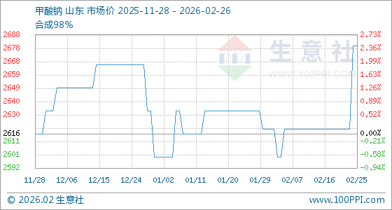 2月26日,生意社甲酸钠基准价为2680.00元/吨,与本月初(2620.00元/吨)相比,上涨了2.29%。