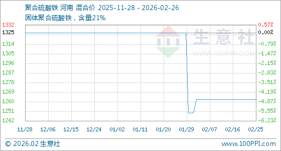 2月26日,生意社聚合硫酸铁基准价为1262.50元/吨,与本月初(1250.00元/吨)相比,上涨了1.00%。