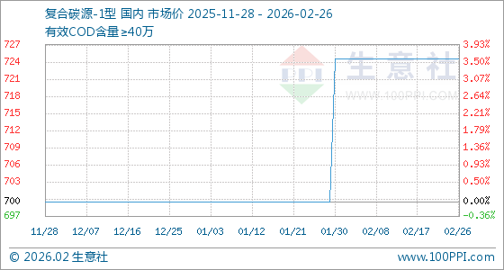 2月26日,生意社复合碳源-1型基准价为725.00元/吨,与本月初持平。