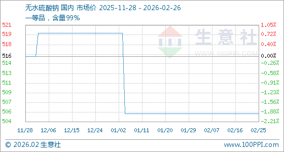 2月26日,生意社无水硫酸钠基准价为506.00元/吨,与本月初持平。
