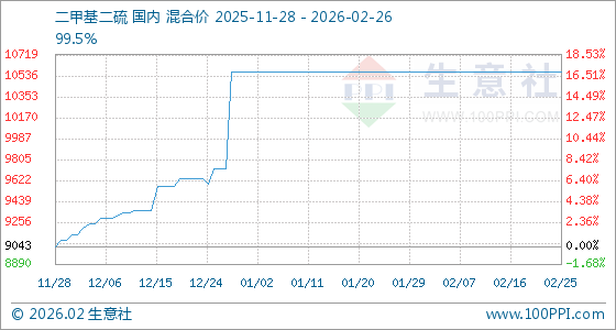 2月26日,生意社二甲基二硫基准价为10566.67元/吨,与本月初持平。