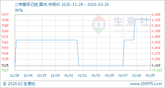 2月26日,生意社二甲基环己烷基准价为7200.00元/吨,与本月初(7125.00元/吨)相比,上涨了1.05%。