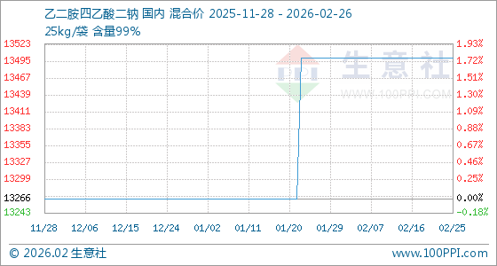 2月26日,生意社乙二胺四乙酸二钠基准价为13500.00元/吨,与本月初持平。